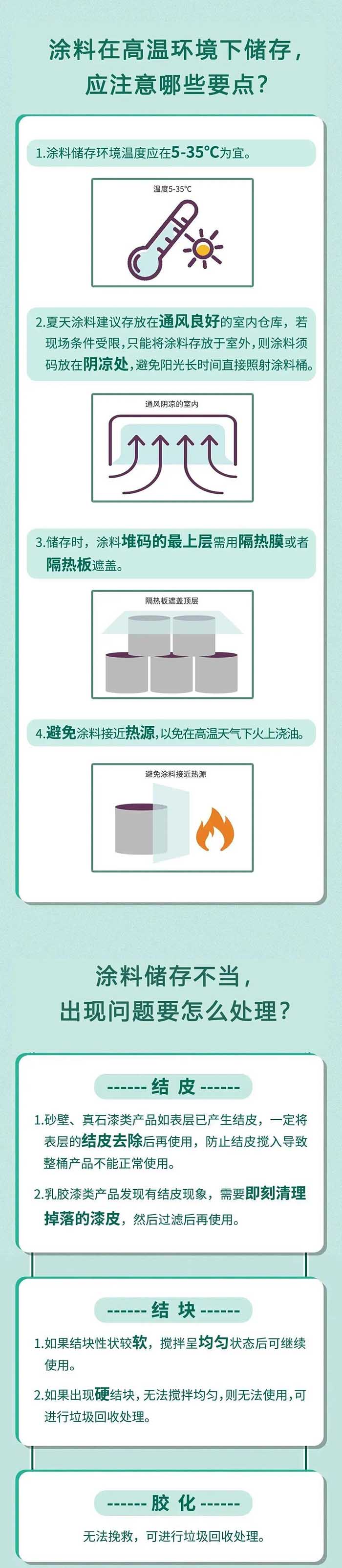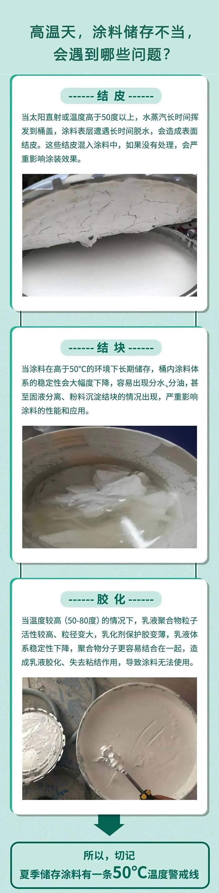 夏天的高溫天氣即將到來。水性涂料在高溫環(huán)境下儲存,或者遭遇長時間的太陽直曬,會導致桶身和桶蓋金屬材質溫度迅速升高,使得與其接觸的涂料,特別是表層涂料出現(xiàn)結皮、結塊、膠化等現(xiàn)象,影響涂料的正常使用。