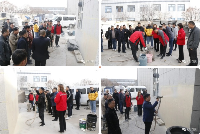培訓現場,七彩貝殼集團以集團的SG-6人工智能噴涂機、SG-9大流量砂漿噴涂機為例,向現場的工人進行了真石漆、保溫顆粒的噴涂演示,并就機器的基本操作問題進行了詳細的講解,現場的工人紛紛進行現場操作,并對機器的噴涂效率、機器的智能化水平給予了充分肯定。